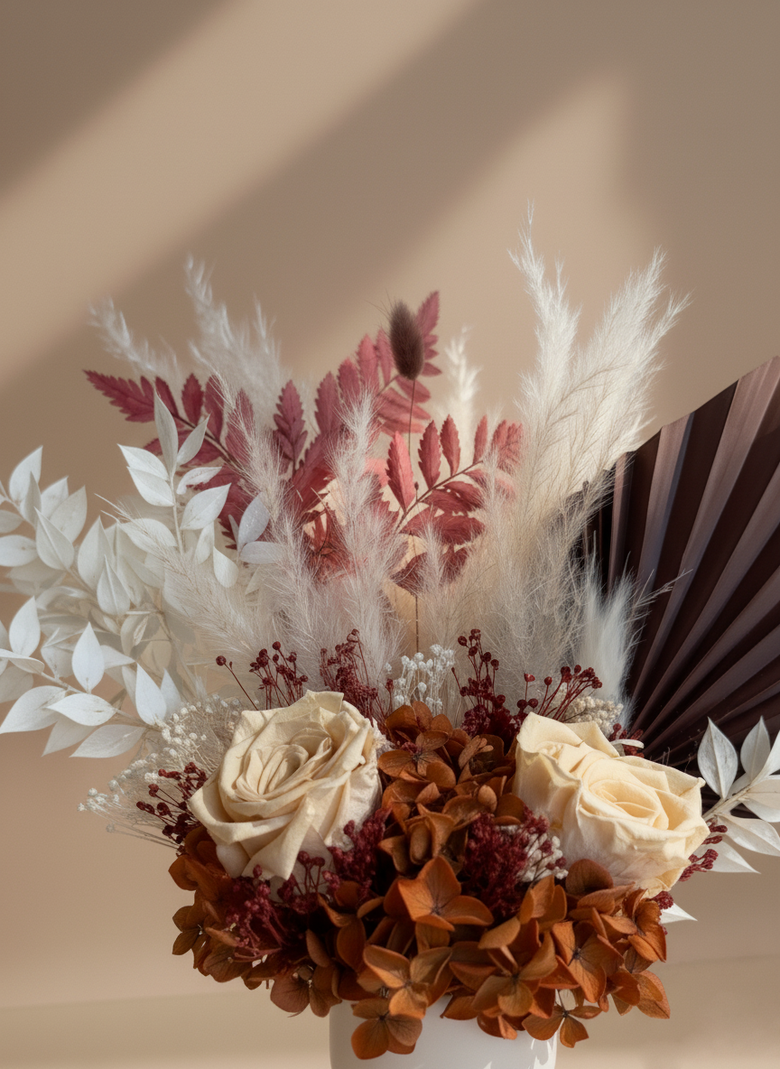 Housed in a minimalist vase, this arrangement features the color of brown, orange, and cream-toned dried flowers.