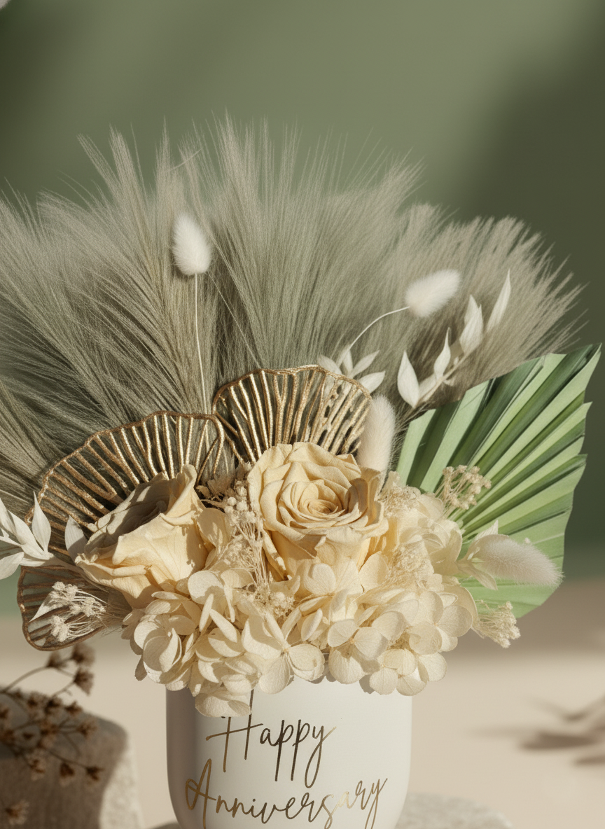 Housed in a customizable minimalist vase perfect for an anniversary. This arrangement features a rich blend of greens and natural hued dried flowers.