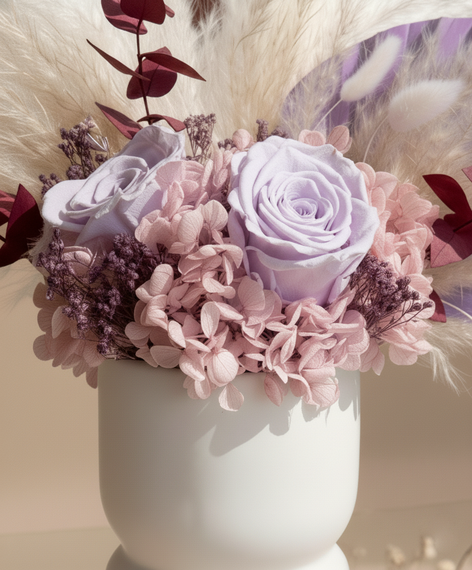 Housed in a minimalist vase, this arrangement features a stunning blend of pink and purple dried flowers with soft natural accent.